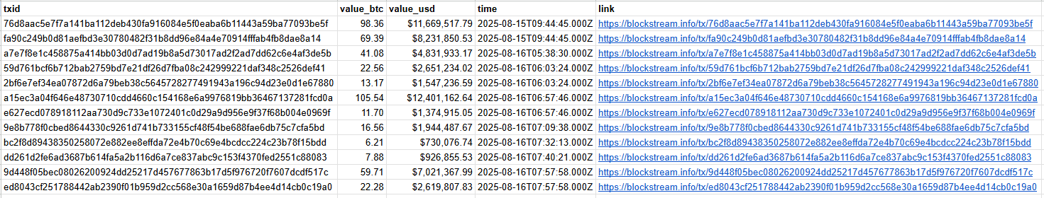 Get real-time alerts for large BTC transactions (10+/5+ BTC movements) with complete data logging.