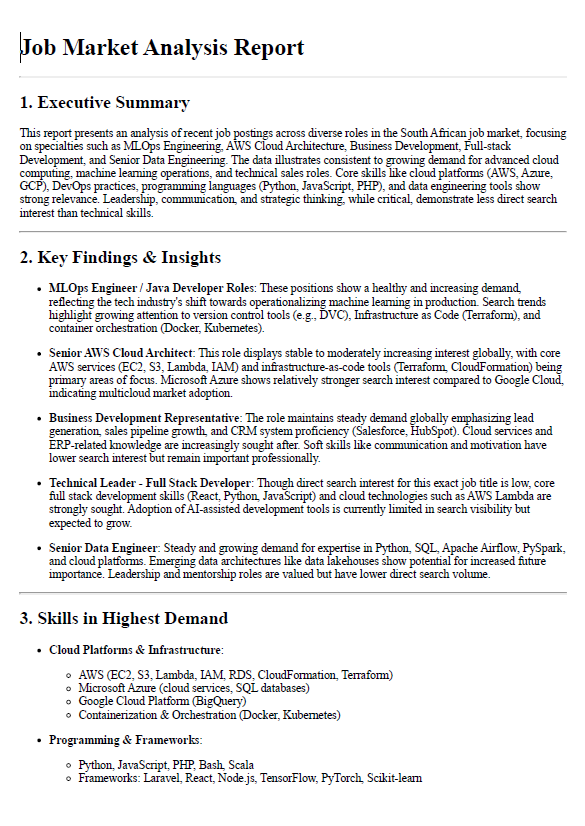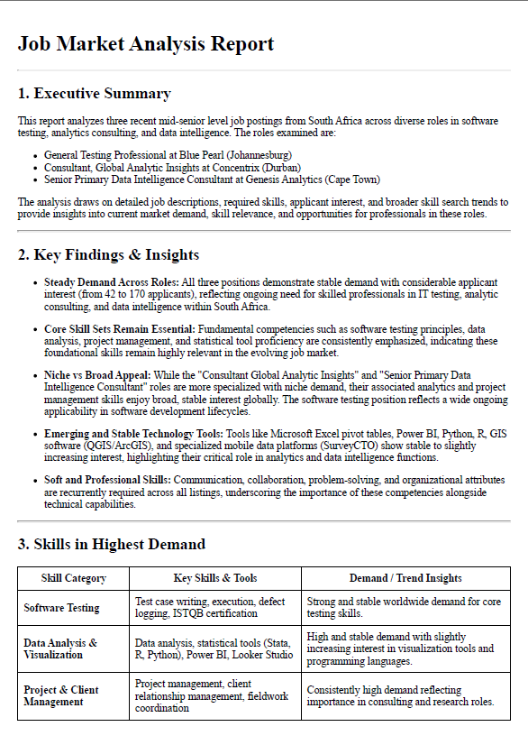 📥 The PDF report includes skills tables, salary trends, and employer synopsis.